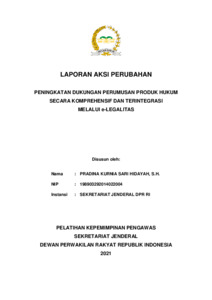 Hidayah, Pradina Kurnia Sari (2021) Peningkatan Dukungan Perumusan Produk Hukum Secara Komprehensif dan Terintegrasi melalui e-Legalitas. Project Report. Pusat Pengembangan Kompetensi Sumber Daya Manusia Legislatif, Jakarta.