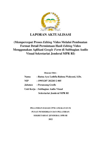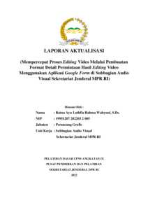 Laporan aktualisasi ini mengangkat isu lambatnya proses editing video di Subbagian Audio Visual Sekretariat Jenderal MPR RI. Proses editing sering terhambat akibat tidak adanya format detail permintaan hasil video, sehingga editor harus melakukan klarifikasi berulang dan revisi berkali-kali terhadap hasil editing. Untuk mengatasi hal tersebut, penulis mengembangkan format permintaan hasil editing video berbasis aplikasi Google Form yang berisi aspek-aspek penting seperti nama pemohon, durasi, tema warna, logo, kualitas, dan tenggat waktu penyerahan. Google Form ini kemudian disosialisasikan melalui poster dan disebarkan menggunakan sistem SMS Gateway kepada seluruh pegawai Setjen MPR RI. Inovasi ini berhasil meningkatkan efektivitas komunikasi antara unit pemohon dan editor, mempercepat waktu pengerjaan video, serta mendukung penerapan nilai ASN BerAKHLAK (Berorientasi Pelayanan, Akuntabel, Kompeten, Adaptif, Kolaboratif) dan konsep Smart ASN dalam penggunaan teknologi digital untuk pelayanan publik.