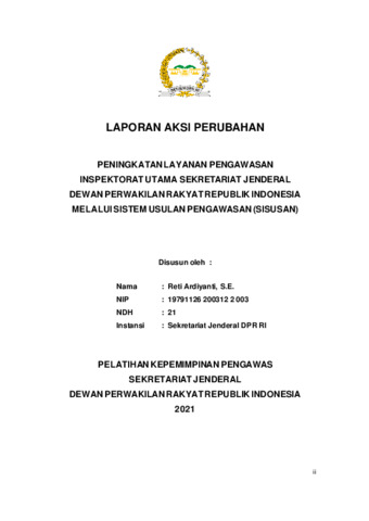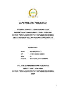 Laporan aksi perubahan ini menguraikan pengembangan Sistem Usulan Pengawasan (SISUSAN) sebagai inovasi digital untuk meningkatkan efektivitas layanan pengawasan di Inspektorat Utama Sekretariat Jenderal DPR RI. Sebelum implementasi SISUSAN, proses pengajuan permintaan pendampingan Audit, Reviu, Evaluasi, Pemantauan, dan Pengawasan Lain (AREPP) dilakukan secara manual dan tidak terdokumentasi secara sistematis, menghambat proses koordinasi dan pelaporan. SISUSAN dirancang sebagai aplikasi berbasis web yang memungkinkan unit kerja melakukan pengajuan usulan pengawasan secara daring, serta memantau status dan progres pengawasan melalui portal siratu.dpr.go.id. Implementasi aksi perubahan dilakukan melalui pembentukan tim efektif lintas bagian, koordinasi dengan Pusat Teknologi Informasi, penyusunan SK penetapan aplikasi, pembuatan buku panduan, serta sosialisasi internal. Aplikasi SISUSAN ditetapkan melalui Keputusan Sekretaris Jenderal DPR RI Nomor 1753/SEKJEN/2021 dan telah diintegrasikan dengan sistem administrasi Inspektorat Utama. Hasil implementasi menunjukkan peningkatan transparansi, kecepatan layanan, dan kemudahan pemantauan kegiatan pengawasan. Inovasi ini mencerminkan penerapan nilai ASN BerAKHLAK (Akuntabel, Kompeten, Adaptif, Kolaboratif) dan memperkuat budaya kerja digital di lingkungan Sekretariat Jenderal DPR RI.
