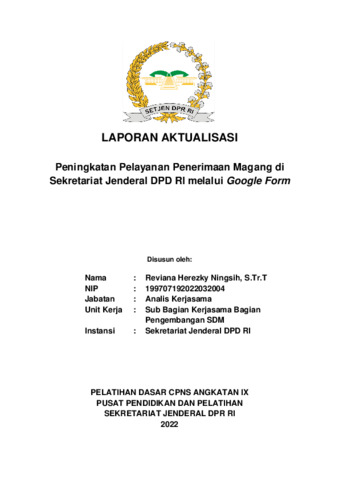 Ningsih, Reviana Herezky (2022) Peningkatan Pelayanan Penerimaan Magang di Sekretariat Jenderal DPD RI melalui Google Form. Project Report. Pusat Pendidikan dan Pelatihan, Jakarta.