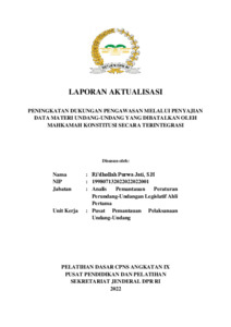 Laporan aktualisasi ini membahas peningkatan dukungan pengawasan DPR RI melalui penyajian data materi Undang-Undang yang dibatalkan oleh Mahkamah Konstitusi secara terintegrasi. Sebelumnya, informasi mengenai pasal-pasal yang dibatalkan oleh Mahkamah Konstitusi belum terdokumentasi dan terdistribusi secara sistematis, sehingga menyulitkan pelaksanaan fungsi pengawasan DPR RI. Melalui kegiatan ini, penulis merancang sistem integrasi data dengan menghubungkan database Pusat Pemantauan Pelaksanaan Undang-Undang dengan aplikasi JDIH DPR RI dan SITERANG, serta menambahkan fitur anotasi digital dan mekanisme WhatsApp blast untuk penyampaian hasil kepada stakeholder legislatif. Proses pelaksanaan mencakup survei kebutuhan pengguna, penyusunan TOR pengembangan sistem, koordinasi lintas unit (Pusat Teknologi Informasi dan Biro Hukum), serta uji coba dan sosialisasi fitur integrasi. Hasil kegiatan menunjukkan peningkatan efisiensi dalam penyajian data, akurasi pemantauan peraturan, serta keterpaduan informasi antara produk hukum dan putusan Mahkamah Konstitusi. Inovasi ini mencerminkan penerapan nilai ASN BerAKHLAK (Akuntabel, Kompeten, Adaptif, Kolaboratif) dan mendukung penguatan fungsi pengawasan DPR RI yang berbasis data digital.