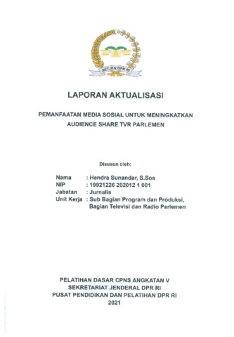 Laporan ini menguraikan kegiatan aktualisasi yang bertujuan meningkatkan audience share TVR Parlemen melalui optimalisasi penggunaan media sosial. Kegiatan dilakukan dengan merancang strategi komunikasi digital berbasis konten informatif, kreatif, dan interaktif yang terintegrasi dengan platform televisi parlemen. Pemanfaatan media sosial, seperti Instagram dan YouTube, diarahkan untuk memperkuat citra lembaga, memperluas jangkauan audiens, serta meningkatkan partisipasi publik terhadap informasi kegiatan DPR RI. Melalui penerapan nilai-nilai ASN seperti profesionalisme, inovasi, dan akuntabilitas, program ini diharapkan mampu mendorong transformasi digital di bidang publikasi parlemen serta memperkuat keterbukaan informasi kepada masyarakat.