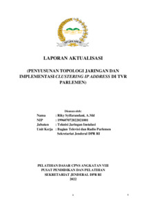Laporan ini membahas optimalisasi jaringan komputer di lingkungan Televisi dan Radio Parlemen (TVR Parlemen) melalui penyusunan topologi jaringan dan penerapan sistem clustering IP address. Sebelumnya, pengelolaan jaringan di TVR Parlemen belum tertata dengan baik, menyebabkan gangguan koneksi yang menghambat produksi tayangan. Penulis melakukan langkah-langkah aktualisasi berupa analisis kebutuhan, koordinasi dengan Pusat Teknologi Informasi (Pustekinfo), penyusunan rancangan topologi jaringan tiap ruangan, penetapan range IP address statis, serta sosialisasi dan penerapan sistem baru di seluruh unit kerja TVR Parlemen. Implementasi menghasilkan pemetaan jaringan yang lebih efisien, kemudahan dalam troubleshooting, dan peningkatan stabilitas koneksi internet untuk mendukung produksi siaran parlemen. Kegiatan ini mencerminkan penerapan nilai ASN BerAKHLAK (Berorientasi Pelayanan, Akuntabel, Kompeten, Adaptif, dan Kolaboratif) serta mendukung Smart ASN dalam bidang teknologi informasi.