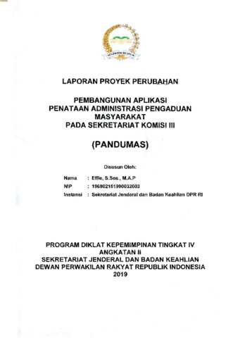 Laporan ini membahas proses pembangunan aplikasi PANDUMAS (Penataan Administrasi Pengaduan Masyarakat) di Sekretariat Komisi III DPR RI sebagai solusi untuk meningkatkan efektivitas penanganan aspirasi masyarakat. Sebelumnya, proses administrasi pengaduan dilakukan secara manual, sehingga sering terjadi keterlambatan, duplikasi, dan kesulitan dalam pelacakan data. Melalui penerapan aplikasi berbasis teknologi informasi, sistem pengelolaan pengaduan menjadi lebih terstruktur, cepat, dan akuntabel. Proyek ini juga mencerminkan penerapan nilai-nilai dasar ASN seperti akuntabilitas, profesionalisme, dan inovasi digital dalam mendukung transparansi serta pelayanan publik yang lebih responsif di lingkungan DPR RI.