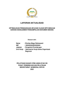 Rahmawati, Rindias Mega (2022) Optimalisasi Penggunaan Aplikasi Cloud DPR sebagai Sarana Manajemen Pengumpulan Dokumen Sidang. Project Report. Pusat Pendidikan dan Pelatihan, Jakarta.