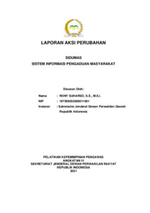 Laporan aksi perubahan ini menguraikan pengembangan Sistem Informasi Pengaduan Masyarakat (SIDUMAS) sebagai inovasi pelayanan publik berbasis teknologi di Sekretariat Jenderal DPD RI. Sebelum adanya SIDUMAS, pengaduan masyarakat kepada Badan Akuntabilitas Publik (BAP) dilakukan secara manual melalui pos, email, atau tatap muka, yang sering menyebabkan keterlambatan dan kurangnya transparansi proses tindak lanjut. Melalui kegiatan aksi perubahan ini, penulis membentuk Tim Efektif dan mengembangkan aplikasi SIDUMAS berbasis website untuk memfasilitasi penyampaian, pemantauan, dan tindak lanjut pengaduan masyarakat secara daring. Aplikasi ini memuat fitur input identitas pengadu, uraian pengaduan, serta sistem tiket pelacakan laporan. Implementasi dilakukan melalui tahapan pembentukan tim, pengumpulan data dan referensi, pembuatan aplikasi, uji coba (pre-sosialisasi), serta sosialisasi kepada para stakeholders. Hasilnya menunjukkan peningkatan efisiensi, transparansi, dan akuntabilitas pelayanan pengaduan publik, sejalan dengan penerapan nilai ASN BerAKHLAK (Akuntabel, Kompeten, Adaptif, Kolaboratif) dan prinsip Good Governance.