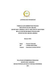 Laporan Aksi Perubahan ini membahas pengelolaan administrasi Pegawai Non Aparatur Sipil Negara (Non ASN) di Sekretariat Jenderal DPR RI yang selama ini masih dilakukan secara manual dan belum terintegrasi. Kondisi tersebut menyebabkan proses administrasi seperti registrasi, verifikasi, dan pengelolaan data pegawai non ASN menjadi kurang efisien. Melalui aksi perubahan ini, penulis menginisiasi pembangunan Sistem Informasi Pegawai Non ASN (SINONA) berbasis web sebagai inovasi layanan administrasi yang efektif dan efisien. Proses pelaksanaan mencakup pembentukan tim efektif, perumusan prototype aplikasi, pembuatan sistem, penyusunan SK penetapan penggunaan aplikasi, uji coba dan sosialisasi kepada pegawai, hingga evaluasi dan perbaikan. Hasilnya, SINONA mampu menyediakan database pegawai non ASN secara digital, lengkap, akurat, mudah diakses, dan terintegrasi antar-unit kerja. Aplikasi ini juga mendukung proses registrasi dan verifikasi data PPNASN serta menjadi basis perencanaan pengelolaan SDM di lingkungan DPR RI. Program ini mencerminkan implementasi nilai-nilai ASN BerAKHLAK dan budaya kerja RAPI (Religius, Akuntabel, Profesional, Integritas), sejalan dengan upaya mewujudkan tata kelola pemerintahan yang profesional dan modern di lingkungan Sekretariat Jenderal DPR RI.