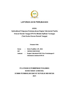 Laporan aksi perubahan ini berjudul “Optimalisasi Pelayanan Ketatausahaan Bagian Sekretariat Panitia Urusan Rumah Tangga DPD RI melalui Aplikasi Turangga (Tata Usaha Urusan Rumah Tangga)”. Inovasi ini dilakukan sebagai respons terhadap kebutuhan modernisasi sistem layanan ketatausahaan yang sebelumnya dilakukan secara manual dan belum efisien, terutama di tengah pembatasan aktivitas akibat pandemi Covid-19. Penulis mengembangkan Aplikasi Turangga, layanan digital berbasis website (www.purtdpdri.com