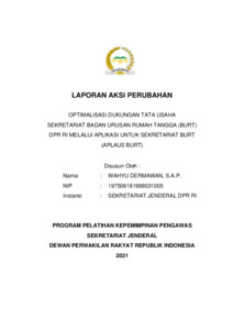 Laporan Aksi Perubahan ini berjudul “Optimalisasi Dukungan Tata Usaha Sekretariat Badan Urusan Rumah Tangga (BURT) DPR RI melalui Aplikasi untuk Sekretariat BURT (APLAUS BURT)”. Kegiatan ini bertujuan meningkatkan efisiensi dan kualitas pelayanan administrasi di Sekretariat BURT DPR RI melalui pengembangan aplikasi digital berbasis database terintegrasi. Sebelumnya, sistem pencatatan arsip, buku, dan data perjalanan dinas masih dilakukan secara manual, menyebabkan keterlambatan pencarian data dan potensi kehilangan dokumen. Melalui aksi perubahan ini, penulis bersama tim efektif mengembangkan APLAUS BURT, sebuah aplikasi dengan tiga fitur utama: (1) Database Arsip, (2) Database Buku, dan (3) Matriks Perjalanan Dinas. Aplikasi ini dibangun secara kolaboratif antara arsiparis, pustakawan, dan pranata komputer, dengan dukungan penuh dari pimpinan BURT, Sekjen DPR RI, serta unit kerja terkait. Implementasi APLAUS BURT menghasilkan peningkatan kecepatan pencarian data dari lebih 15 menit menjadi kurang dari 5 menit, menekan kesalahan pencatatan, serta mendukung prinsip paperless office dan good governance. Inovasi ini mencerminkan penerapan nilai ASN BerAKHLAK (Akuntabel, Kompeten, Adaptif, Kolaboratif) dan menjadi bagian dari transformasi digital menuju Parlemen Modern.