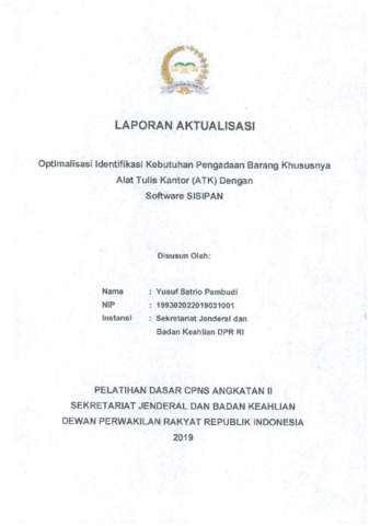 Dokumen ini merupakan laporan aktualisasi yang isusun oleh Yusuf Satrio Pambudi sebagai bagian dari Pelatihan Dasar CPNS di lingkungan Sekretariat Jenderal dan Badan Keahlian DPR RI. Laporan ini mengangkat isu kurang optimalnya identifikasi kebutuhan pengadaan barang, khususnya alat tulis kantor (ATK), yang berdampak pada kelangkaan dan ketidakefisienan distribusi ATK di berbagai unit kerja. Melalui analisis USG (Urgency, Seriousness, Growth), ditemukan bahwa isu utama yang perlu segera ditangani adalah kurangnya kajian kebutuhan ATK. Sebagai solusi, penulis merancang dan mengimplementasikan software SISIPAN (Software Identifikasi Kebutuhan Pengadaan) berbasis web yang bertujuan untuk mempermudah proses pencatatan, pengelolaan, dan pelaporan kebutuhan ATK secara sistematis dan akuntabel. Software ini dikembangkan melalui serangkaian kegiatan mulai dari koordinasi lintas unit, pengumpulan data, perancangan antarmuka, hingga sosialisasi kepada pengguna. Hasil aktualisasi menunjukkan bahwa penggunaan SISIPAN dapat meningkatkan efisiensi pengadaan, memperkuat akuntabilitas, serta mendukung prinsip-prinsip nilai dasar ASN seperti integritas, etika publik, dan komitmen mutu.