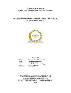 Laporan aktualisasi ini berjudul “Optimalisasi Penerapan Aplikasi E-Monev Bappenas di Lingkup Sekretariat Jenderal DPR RI.” Program ini dilaksanakan untuk meningkatkan efektivitas pelaporan capaian output Setjen DPR RI melalui aplikasi E-Monev milik Kementerian PPN/Bappenas. Sebelumnya, pelaporan dilakukan secara terpusat oleh Bagian Perencanaan dengan data yang diambil dari aplikasi internal Sicaput, namun banyak data yang tidak valid dan menghambat ketepatan waktu pelaporan. Melalui aksi perubahan ini, penulis merancang tutorial digital (E-Book dan video interaktif) untuk panduan pengisian aplikasi E-Monev, serta mengintegrasikannya dengan aplikasi Sicaput agar pengguna (operator unit kerja Eselon II) dapat mengakses panduan dengan mudah. Implementasi dilakukan melalui tahapan koordinasi, pembuatan materi digital, sosialisasi internal, dan integrasi sistem. Hasilnya, proses pelaporan menjadi lebih cepat, data lebih akurat, dan pengguna lebih memahami fungsi pelaporan capaian output. Inovasi ini mendukung penerapan nilai ASN BerAKHLAK (Berorientasi Pelayanan, Akuntabel, Kompeten, Adaptif, Kolaboratif) serta sejalan dengan upaya digitalisasi sistem evaluasi kinerja pemerintah.