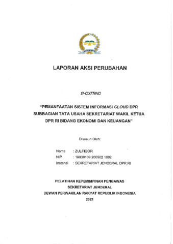 Laporan ini menyajikan hasil aksi perubahan yang dilakukan oleh Zulfiqor, S.Kom., dalam rangka Pelatihan Kepemimpinan Pengawas di lingkungan Sekretariat Jenderal DPR RI. Aksi perubahan ini bertujuan untuk meningkatkan efisiensi dan efektivitas pelayanan ketatausahaan melalui pemanfaatan sistem informasi cloud yang diberi nama SI-CUTTING. Sebelum implementasi, pengelolaan data masih dilakukan secara manual dan tersebar di perangkat pribadi, yang menyulitkan akses saat bekerja dari luar kantor. Melalui SI-CUTTING, data dapat disimpan, diakses, dan dibagikan secara digital dan online, kapan saja dan di mana saja, selama tersedia koneksi internet. Proyek ini melibatkan pembentukan tim efektif, penyusunan buku panduan, sosialisasi, serta proses digitalisasi dan migrasi data. Hasilnya menunjukkan peningkatan signifikan dalam pengelolaan arsip dan pelayanan administrasi. Aksi ini mendapat dukungan luas dari berbagai pemangku kepentingan dan diharapkan berkelanjutan serta terintegrasi dengan sistem lain di masa depan.