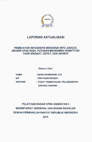 Laporan ini membahas kegiatan aktualisasi berupa pembuatan infografis yang menampilkan informasi hasil judicial review putusan Mahkamah Konstitusi secara singkat, cepat, dan akurat di Pusat Perancangan Undang-Undang DPR RI. Sebelumnya, penyajian hasil putusan dilakukan dalam format teks panjang yang kurang efisien untuk kebutuhan analisis perancang undang-undang. Melalui inovasi ini, hasil judicial review disajikan dalam bentuk infografis digital yang mudah diakses dan dipahami, sehingga mempercepat proses pengambilan referensi hukum dalam penyusunan rancangan undang-undang. Kegiatan ini mendukung efektivitas kerja lembaga, memperkuat transparansi informasi hukum, serta mencerminkan penerapan nilai ASN profesional, akuntabel, dan adaptif terhadap perkembangan teknologi informasi di lingkungan DPR RI.