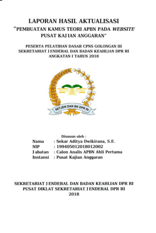 Laporan ini menguraikan kegiatan aktualisasi berupa pembuatan Kamus Teori APBN pada website Pusat Kajian Anggaran DPR RI sebagai sarana literasi dan referensi istilah ekonomi-fiskal bagi pengguna internal maupun publik. Sebelumnya, akses terhadap teori dan istilah APBN tersebar di berbagai dokumen dan belum terintegrasi secara digital. Melalui pengembangan fitur kamus daring berbasis web, informasi tentang konsep, teori, dan terminologi APBN dapat diakses lebih cepat, akurat, dan mudah dipahami. Inovasi ini mendukung peningkatan efektivitas kerja peneliti serta transparansi pengetahuan kebijakan fiskal di DPR RI, sekaligus mencerminkan nilai ASN profesional, adaptif, dan berorientasi pelayanan publik dalam pemanfaatan teknologi informasi untuk pengelolaan data anggaran negara.