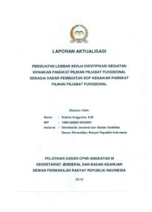 Anggraita, Sukma (2019) Pembuatan Lembar Kerja Identifikasi Kegiatan Kenaikan Pangkat Pilihan Pejabat Fungsional Sebagai Dasar Pembuatan SOP Kenaikan Pangkat Pilihan Pejabat fungsional. Project Report. Pusat Pengembangan Kompetensi Sumber Daya Manusia Legislatif, Jakarta.