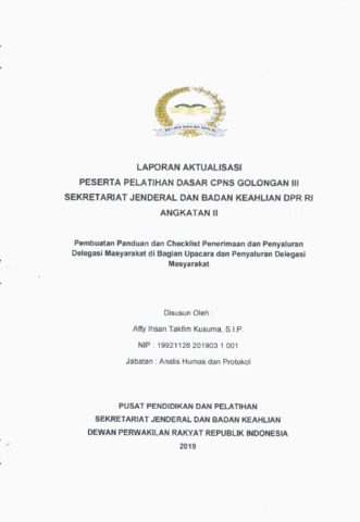 Kusuma, Affy Ihsan Takfim (2019) Pembuatan Panduan Dan Checklist Penerimaan Dan Penyaluran Delegasi Masyarakat Di Bagian Upacara Dan Penyaluran Delegasi Masyarakat 2019. Project Report. Pusat Pengembangan Kompetensi Sumber Daya Manusia Legislatif, Jakarta.