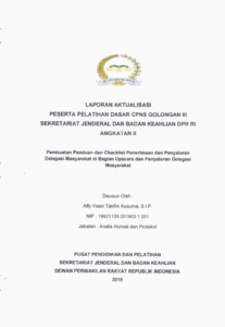 Laporan ini membahas kegiatan aktualisasi yang berjudul Pembuatan Panduan dan Checklist Penerimaan dan Penyaluran Delegasi Masyarakat di Bagian Upacara dan Penyaluran Delegasi Masyarakat. Kegiatan ini dilatarbelakangi oleh belum optimalnya sistem pelayanan terhadap masyarakat yang datang menyampaikan aspirasi ke DPR RI, sehingga diperlukan pedoman kerja yang jelas dan seragam. Melalui penyusunan panduan dan checklist ini, setiap petugas dapat mengikuti alur pelayanan yang terstruktur mulai dari penerimaan hingga penyaluran aspirasi masyarakat kepada unit terkait. Inovasi ini membantu meningkatkan efisiensi, akuntabilitas, serta konsistensi layanan keprotokolan dan publik DPR RI, sekaligus mencerminkan penerapan nilai ASN ANEKA (Akuntabilitas, Nasionalisme, Etika Publik, Komitmen Mutu, dan Anti Korupsi) dalam pelaksanaan tugas pemerintahan yang berorientasi pada pelayanan masyarakat.