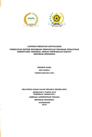 Laporan ini membahas kegiatan aktualisasi yang berjudul Pembuatan Sistem Informasi Pengusulan Program Peraturan Sekretaris Jenderal DPR RI, yang dilaksanakan di Biro Hukum dan Pengaduan Masyarakat Sekretariat Jenderal dan Badan Keahlian DPR RI. Kegiatan ini dilatarbelakangi oleh belum optimalnya proses pengusulan peraturan yang masih dilakukan secara manual dan tidak terintegrasi, sehingga menimbulkan keterlambatan serta duplikasi usulan antarunit kerja. Melalui inovasi sistem informasi berbasis portal DPR, proses pengusulan menjadi lebih efisien, transparan, dan terdokumentasi dengan baik. Unit kerja pengusul dapat mengunggah dokumen dan memantau status usulan secara daring. Hasil kegiatan ini mendukung terwujudnya tata kelola kelembagaan yang modern, akuntabel, dan berbasis teknologi informasi, sejalan dengan visi parlemen modern dan penerapan nilai-nilai ASN ANEKA.
