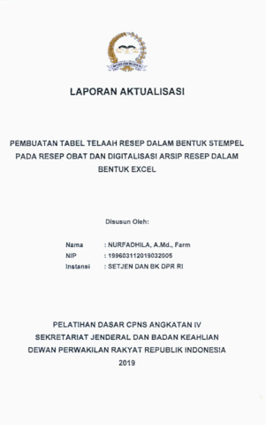 Nurfadhila, Nurfadhila (2019) Pembuatan Tabel Telaah Resep Dalam Bentuk Stempel Pada Resep Obat Dan Digitalisasi Arsip Resep Dalam Bentuk Excel. Project Report. Pusat Pengembangan Kompetensi Sumber Daya Manusia Legislatif, Jakarta.