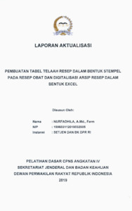 Laporan ini membahas kegiatan aktualisasi berjudul Pembuatan Tabel Telaah Resep dalam Bentuk Stempel pada Resep Obat dan Digitalisasi Arsip Resep dalam Bentuk Excel di Bagian Pelayanan Kesehatan Sekretariat Jenderal dan Badan Keahlian DPR RI. Kegiatan ini bertujuan untuk meningkatkan mutu pelayanan farmasi dengan memastikan ketepatan obat, dosis, waktu, dan cara pemberian melalui penerapan prinsip “6 benar” dalam telaah resep. Selain itu, digitalisasi arsip resep dilakukan agar pencarian data resep pasien menjadi lebih cepat, tepat, dan akurat. Inovasi ini mendukung penerapan standar pelayanan kefarmasian sesuai Permenkes No. 73 Tahun 2016 dan mencerminkan penerapan nilai ASN ANEKA seperti akuntabilitas, komitmen mutu, serta etika publik dalam pelayanan kesehatan yang profesional, efisien, dan berorientasi pada keselamatan pasien.