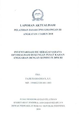 Laporan aktualisasi berjudul “Inventarisasi Isu sebagai Sarana Optimalisasi Dukungan Pusat Kajian Anggaran dengan Komisi IX DPR RI” ini disusun dalam rangka Pelatihan Dasar CPNS di lingkungan Sekretariat Jenderal dan Badan Keahlian DPR RI. Kegiatan ini berfokus pada penguatan peran Pusat Kajian Anggaran (Puskaji Anggaran) dalam mendukung fungsi pengawasan dan legislasi Komisi IX DPR RI melalui penyusunan instrumen inventarisasi isu strategis. Inovasi ini bertujuan menciptakan sistem pencatatan dan klasifikasi isu yang sistematis, berbasis data, dan mudah diperbarui, sehingga hasil kajian lebih tepat sasaran dan responsif terhadap kebutuhan mitra kerja DPR. Metode yang digunakan meliputi analisis dokumen, identifikasi isu sektoral (kesehatan, ketenagakerjaan, dan kependudukan), serta pengelompokan tematik berbasis urgensi dan relevansi kebijakan. Hasil aktualisasi menunjukkan peningkatan efektivitas koordinasi antara unit kajian dan komisi, serta mendukung transformasi kelembagaan menuju knowledge-based parliament.