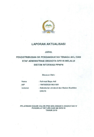 Adi, Rahmad Bayu (2019) Pendistribusian SK Pengangkatan Tenaga Ahli Dan Staf Administrasi Anggota DPR RI Melalui Sistem Informasi PPNPN. Project Report. Pusat Pengembangan Kompetensi Sumber Daya Manusia Legislatif, Jakarta.
