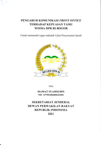 Syamsudin, Mamat (2021) Pengaruh Komunikasi Front Office Terhadap Kepuasan Tamu Wisma DPR RI Bogor. Project Report. Pusat Pengembangan Kompetensi Sumber Daya Manusia Legislatif, Jakarta.