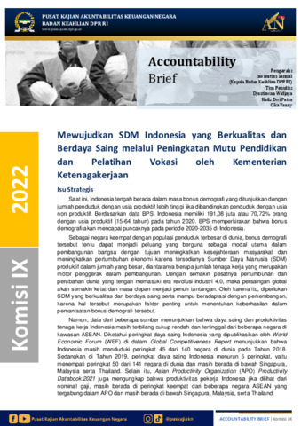 Widjaya, Djustiawan, Putra, Hafiz Dwi and Cika, Vanny (2022) Mewujudkan SDM Indonesia yang Berkualitas dan Berdaya Saing melalui Peningkatan Mutu Pendidikan dan Pelatihan Vokasi oleh Kementerian Ketenagakerjaan. Accountability Brief.