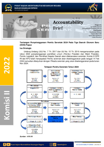 Widjaya, Djustiawan, Fadli, Slamet Dhul, Syahbana, Agam Noor and Prasetiya, Lalan (2022) Tantangan Penyelenggaraan Pemilu Serentak 2024 Pada Tiga Daerah Otonom Baru (DOB) Papua. Accountability Brief.