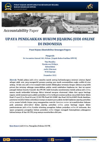 Widjaya, Djustiawan, Sukmalalana, Sukmalalana, Oktaviani, Andri and Septuaji, Widi (2022) Upaya Penegakkan Hukum Jejaring Judi Online di Indonesia. Discussion Paper. Sekretariat Jenderal DPR RI, Jakarta.