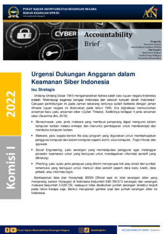 Widjaya, Djustiawan, Pidhegso, Achmad Yugo and Ramadhan, Mochammad (2022) Urgensi Dukungan Anggaran dalam Keamanan Siber Indonesia. Accountability Brief.