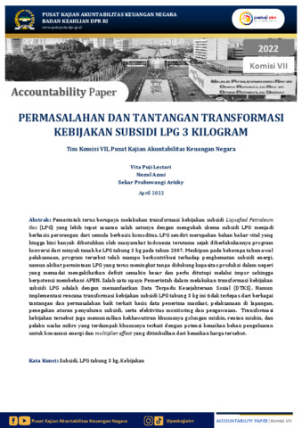 Lestari, Vita Puji, Azmi, Nuzul and Arizky, Sekar Prabuwangi (2022) Permasalahan dan Tantangan Transformasi Kebijakan Subsidi LPG 3 Kilogram. Discussion Paper. Sekretariat Jenderal DPR RI, Jakarta.