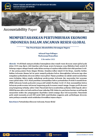 Pidhegso, Achmad Yugo and Ramadhan, Mochammad (2022) Mempertahankan Pertumbuhan Ekonomi Indonesia dalam Ancaman Resesi Global. Discussion Paper. Pusat Kajian Akuntabilitas Keuangan Negara, Jakarta.