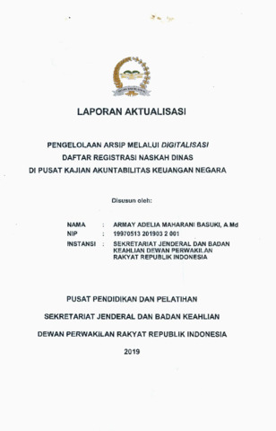 Basuki, Armay Adelia Maharani (2019) Pengelolaan Arsip Melalui Digitalisasi Daftar Registrasi Naskah Dinas Dl Pusat Kajian Akuntabilitas Keuangan Negara. Project Report. Pusat Pengembangan Kompetensi Sumber Daya Manusia Legislatif Sekretariat Jenderal DPR RI, Jakarta.