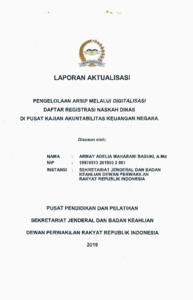 Laporan ini membahas kegiatan aktualisasi berjudul Pengelolaan Arsip melalui Digitalisasi Daftar Registrasi Naskah Dinas di Pusat Kajian Akuntabilitas Keuangan Negara. Kegiatan ini dilatarbelakangi oleh belum optimalnya sistem pengarsipan naskah dinas yang masih manual, sehingga menyebabkan keterlambatan informasi dan risiko kehilangan dokumen. Melalui inovasi digitalisasi daftar registrasi arsip berbasis Google Sheets dan penyimpanan terintegrasi dengan Google Drive, setiap surat masuk, surat keluar, nota dinas, dan disposisi dapat terdokumentasi secara sistematis dan mudah diakses. Hasil implementasi menunjukkan peningkatan efisiensi kerja, transparansi, dan kecepatan dalam proses administrasi. Inovasi ini mendukung penerapan tata kelola arsip modern dan mencerminkan nilai-nilai ASN ANEKA seperti akuntabilitas, komitmen mutu, etika publik, serta pelayanan publik berbasis teknologi informasi di lingkungan DPR RI.