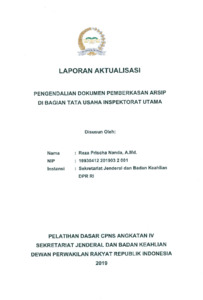 Laporan ini membahas kegiatan aktualisasi berjudul Pengendalian Dokumen Pemberkasan Arsip di Bagian Tata Usaha Inspektorat Utama yang dilaksanakan di Sekretariat Jenderal dan Badan Keahlian DPR RI. Kegiatan ini berangkat dari permasalahan belum optimalnya sistem pengendalian dan inventarisasi dokumen arsip kegiatan, yang menyebabkan kesulitan dalam pencarian dan pelaporan data. Sebagai solusi, penulis merancang dan menerapkan sistem checklist pemberkasan arsip yang dilengkapi dengan penyimpanan digital berbasis cloud, sehingga seluruh bukti dan dokumen kegiatan dapat terdokumentasi secara rapi, transparan, dan mudah diakses. Inovasi ini memperkuat nilai akuntabilitas dan komitmen mutu ASN, serta mendukung penerapan prinsip Whole of Government dalam tata kelola arsip pemerintahan modern.