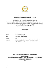 Laporan aksi perubahan ini bertujuan untuk meningkatkan efektivitas dan efisiensi pengelolaan agenda pimpinan di lingkungan Sekretariat Jenderal DPD RI melalui digitalisasi sistem persuratan dan kearsipan. Permasalahan utama yang diidentifikasi adalah pengelolaan surat masuk dan penjadwalan kegiatan pimpinan yang masih dilakukan secara konvensional, sehingga menimbulkan kendala dalam alur informasi, akurasi jadwal, dan pengawasan kegiatan. Sebagai solusi, penulis merancang dan mengimplementasikan aplikasi SIAGAN (Sistem Informasi Agenda Pimpinan) yang mengintegrasikan pengelolaan surat masuk, disposisi, klasifikasi agenda, dan penjadwalan kegiatan pimpinan secara elektronik. Aplikasi ini diharapkan dapat meningkatkan pelayanan publik yang cepat, tepat, profesional, akuntabel, dan modern. Aksi perubahan ini juga mencakup penyusunan SOP, pelatihan internal, sosialisasi eksternal, serta evaluasi berkelanjutan untuk memastikan keberlanjutan dan pengembangan sistem. Hasil implementasi menunjukkan peningkatan kualitas kerja, keteraturan agenda, dan aksesibilitas informasi bagi pimpinan dan stakeholders.