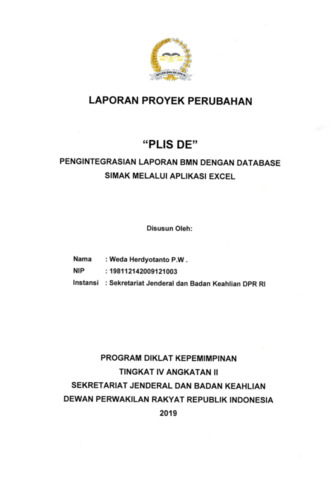 Herdyotanto, Weda (2019) Laporan proyek perubahan : “plis de” pengintegrasian laporan BMN dengan database simak melalui aplikasi excel. Project Report. Dewan Perwakilan Rakyat Republik Indonesia, Jakarta.