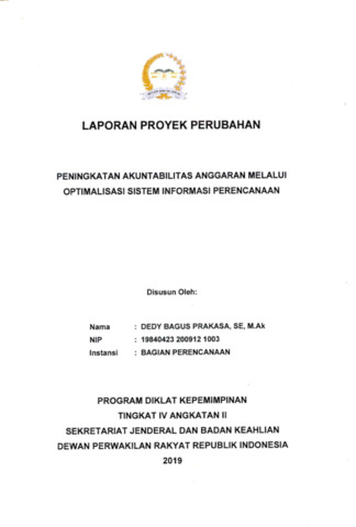 Prakasa, Dedy Bagus (2019) Laporan proyek perubahan : peningkatan akuntabilitas anggaran melalul optimalisasi sistem informasi perencanaan. Project Report. Dewan Perwakilan Rakyat Republik Indonesia, Jakarta.