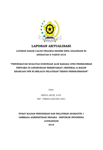 Muiz, Abdul (2018) Laporan aktualisasi : kualitas dukungan alih bahasa cpns penerjemah pertama di lingkungan sekretariat jenderal & badan keahlian DPR RI melalui pelatihan teknis penerjemahan. Project Report. Dewan Perwakilan Rakyat Republik Indonesia, Jakarta.