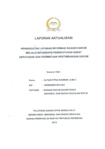 rahman, alfian fitra (2019) Laporan aktualisasi : peningkatan layanan informasi bagian hukum melalui infografis pembentukan surat keputusan dan permintaan pertimbangan hukum. Project Report. Dewan Perwakilan Rakyat Republik Indonesia, Jakarta.
