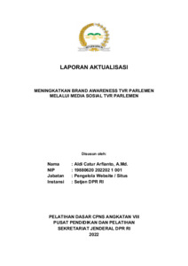Laporan aktualisasi ini disusun sebagai bagian dari Pelatihan Dasar CPNS di Sekretariat Jenderal DPR RI. Fokus utama laporan adalah peningkatan brand awareness TVR Parlemen melalui optimalisasi media sosial. Berdasarkan hasil observasi, ditemukan beberapa isu seperti ketidakkonsistenan penggunaan logo, tidak adanya opening pada paket berita di kanal YouTube, serta rendahnya engagement rate di media sosial. Untuk mengatasi hal tersebut, penulis merancang pedoman desain grafis (Graphic Standard Manual) dan membuat fun content berupa kuis interaktif dalam rangka HUT DPR RI ke-77. Kegiatan aktualisasi meliputi koordinasi tim media sosial, penyusunan desain, sosialisasi, pengunggahan konten, evaluasi insight media sosial, hingga dokumentasi testimoni pemenang kuis. Hasilnya menunjukkan peningkatan interaksi dan kesadaran publik terhadap brand TVR Parlemen. Aktualisasi ini mencerminkan penerapan nilai-nilai ASN BerAKHLAK dan mendukung visi Sekretariat Jenderal DPR RI dalam mewujudkan pelayanan informasi yang profesional dan modern.