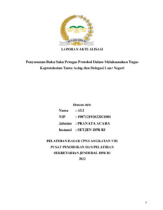 Laporan aktualisasi ini disusun sebagai bagian dari Pelatihan Dasar CPNS Angkatan VIII di Sekretariat Jenderal DPR RI. Fokus utama dari laporan adalah penyusunan buku saku sebagai pedoman bagi petugas protokol dalam melaksanakan tugas keprotokolan, khususnya saat menerima tamu asing dan delegasi luar negeri. Berdasarkan identifikasi isu, ditemukan bahwa petugas protokol belum memiliki acuan standar dalam berkomunikasi dan bertindak saat bertugas dengan delegasi internasional, terutama terkait penggunaan bahasa Inggris. Hal ini berpotensi menimbulkan kesalahan komunikasi dan menurunkan kualitas pelayanan keprotokolan. Melalui metode USG (Urgency, Seriousness, Growth), isu ini ditetapkan sebagai prioritas. Solusi yang diusulkan adalah penyusunan buku saku yang berisi panduan teknis dan komunikasi dasar dalam bahasa Inggris. Proses aktualisasi meliputi perencanaan, knowledge sharing, penyusunan draft, evaluasi, dan sosialisasi. Hasilnya diharapkan dapat meningkatkan kompetensi, kepercayaan diri, dan profesionalisme petugas protokol dalam menjalankan tugas keprotokolan internasional.