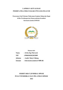 Laporan aktualisasi ini disusun sebagai bagian dari Pelatihan Dasar CPNS Golongan III di Sekretariat Jenderal MPR RI. Fokus utama dari laporan adalah penyusunan draft pedoman pelaksanaan kegiatan sidang dan rapat untuk jabatan Analis Materi Sidang, yang merupakan jabatan baru hasil penyederhanaan birokrasi. Permasalahan yang diangkat adalah belum adanya petunjuk teknis dan pelaksanaan yang jelas bagi jabatan tersebut, serta tidak tersedianya arsip digital yang mendukung pelaksanaan tugas. Melalui metode APKL (Aktual, Problematik, Kekhalayakan, dan Kelayakan), isu ini ditetapkan sebagai prioritas. Solusi yang ditawarkan adalah penyusunan pedoman yang mencakup alur kerja, kebutuhan teknis, dan koordinasi antar unit. Kegiatan aktualisasi meliputi identifikasi kebutuhan, penyusunan draft, sosialisasi kepada stakeholder, dan penyusunan laporan akhir. Hasilnya diharapkan dapat meningkatkan efektivitas, efisiensi, dan akuntabilitas pelaksanaan sidang dan rapat di lingkungan Sekretariat Jenderal MPR RI, serta memperkuat penerapan nilai-nilai ASN BerAKHLAK.