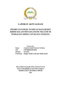 Laporan aktualisasi ini disusun sebagai bagian dari Pelatihan Dasar CPNS Angkatan IX di Sekretariat Jenderal DPR RI. Fokus utama dari laporan adalah pembuatan buku panduan manajemen krisis untuk menangani isu negatif yang menimpa DPR RI, khususnya di Subbagian Media Cetak dan Website. Berdasarkan observasi, penanganan isu negatif selama ini dilakukan secara spontan tanpa sistem yang terstruktur, sehingga berpotensi memperburuk reputasi lembaga. Untuk mengatasi hal tersebut, penulis merancang buku panduan yang mencakup tahapan krisis, strategi komunikasi, alur koordinasi, dan pembagian tugas dalam tim manajemen krisis. Proses aktualisasi meliputi identifikasi isu, diskusi dengan mentor dan rekan kerja, penyusunan draft, pembuatan buku panduan, sosialisasi, dan evaluasi. Hasilnya diharapkan dapat meningkatkan efektivitas penanganan isu negatif, memperkuat peran jurnalis sebagai pelayan publik, serta mendukung misi Sekretariat Jenderal DPR RI dalam menjaga reputasi dan kepercayaan publik.