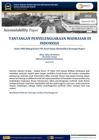 Dwikirana, Sekar Aditya, Lestari, Ayu Setya and Mu’min D., Muhammad Ikhlashul (2022) Tantangan Penyelenggaraan Madrasah di Indonesia. Working Paper. Pusat Kajian Akuntabilitas Keuangan Negara Badan Keahlian DPR RI, Jakarta.