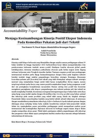 Pranchiska, Indah, Darma, Teuku Surya and Wuryantina, Hamas (2022) Menjaga Kesinambungan Kinerja Positif Ekspor Indonesia pada Komoditas Pakaian Jadi dari Tekstil. Working Paper. PUSAT KAJIAN AKUNTABILITAS KEUANGAN NEGARA BADAN KEAHLIAN DPR RI, Jakarta.
