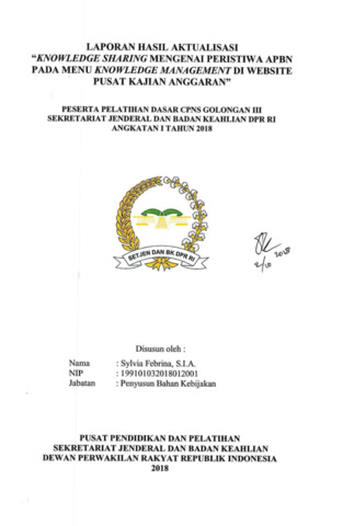 Knowledge Sharing Mengenai Peristiwa APBN pada Menu Knowledge Management di Website Pusat Kajian Anggaran merupakan laporan kegiatan yang menjelaskan proses berbagi pengetahuan (knowledge sharing) terkait berbagai peristiwa APBN yang diolah dan dipublikasikan melalui menu Knowledge Management pada laman Pusat Kajian Anggaran DPR RI. Laporan ini menguraikan tujuan kegiatan, metodologi pengumpulan informasi, langkah-langkah penyusunan konten, serta mekanisme diseminasi pengetahuan kepada pemangku kepentingan internal dan publik. Kegiatan ini bertujuan meningkatkan literasi anggaran, memperluas akses informasi APBN, memperkuat pengelolaan pengetahuan kelembagaan, dan mendorong pemanfaatan data fiskal sebagai dasar analisis kebijakan. Dokumen ini memaparkan manfaat dari implementasi knowledge sharing, termasuk peningkatan transparansi, akuntabilitas, dan efektivitas penyebarluasan informasi anggaran.