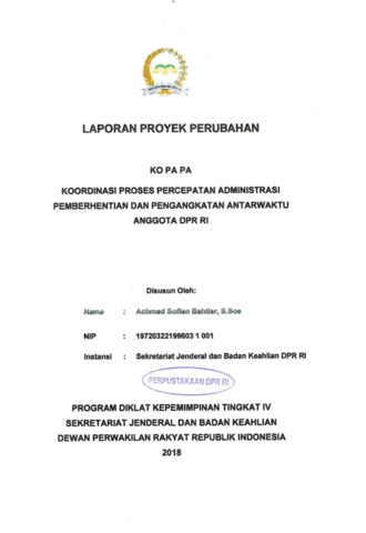 Laporan ini memaparkan upaya mempercepat proses administrasi pemberhentian dan pengangkatan antarwaktu (PAW) Anggota DPR RI yang selama ini mengalami keterlambatan karena birokrasi, padatnya jadwal pimpinan, dan sistem penyimpanan dokumen yang masih manual. Proyek perubahan ini membangun mekanisme koordinasi yang lebih efisien melalui pembentukan tim efektif, digitalisasi data PAW, dan pemanfaatan komunikasi daring (WhatsApp) untuk monitoring, koordinasi, dan percepatan proses administrasi. Laporan menjelaskan landasan hukum, identifikasi stakeholder, strategi komunikasi, milestone implementasi, analisis kendala, serta rekomendasi keberlanjutan. Hasilnya menunjukkan percepatan proses administrasi PAW, peningkatan akuntabilitas, serta penguatan tata kelola administrasi Sekretariat Jenderal DPR RI.