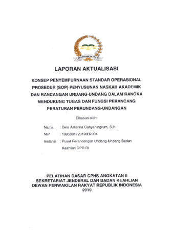 Laporan menjelaskan latar belakang perlunya perbaikan SOP karena belum optimalnya alur kerja, tidak adanya pengaturan tahapan tindak lanjut setelah presentasi di AKD/Anggota DPR, serta kebutuhan penyesuaian SOP dengan dinamika kerja perancang peraturan. Dokumen ini memaparkan analisis masalah, teknik USG, rancangan kegiatan aktualisasi, hasil wawancara dengan legislative drafter senior, serta draft penyempurnaan SOP termasuk penambahan tahapan pengunggahan NA/RUU ke SIMAS PUU dan penyesuaian waktu kerja. Laporan ini bertujuan meningkatkan efektivitas, efisiensi, akuntabilitas, dan keselarasan SOP dengan praktik aktual penyusunan NA dan RUU.